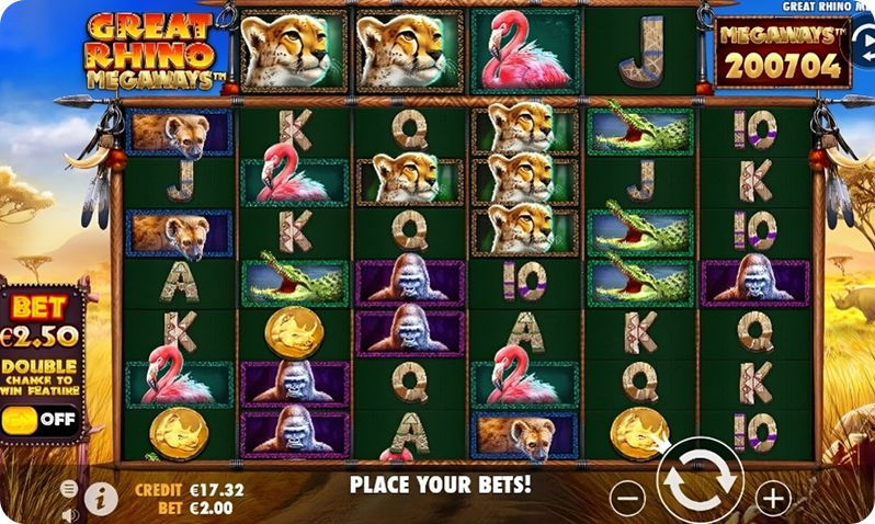 In Great Rhino Megaways, the symbols complement the African safari theme. You’ll encounter a mix of classic playing card royals, along with some animal symbols on the layout. These symbols include Cheetah, Gorilla, Crocodile, Hyena, Flamingo, Ace, King, Queen, Jack, and 10. These symbols can be classified as high-paying and low-paying, depending on the paytable values each symbol carries on the game.
