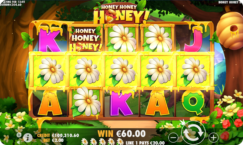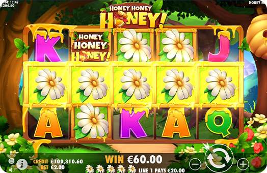 Honey Honey Honey slot game features a standard 5 reels and 3 rows with 20 paylines. The wins are considered from left to right, starting from reel number 1. Just like with any other slots game online this game too comes with two special symbols – the wilds which are represented by the worker bee and the bonus symbol. The wilds not only substitutes the other symbols on the board but also provided with 25 times the stake for 5 symbols on the board. The bonus symbol provides players with free spins; this symbol appears only on odd number reels and players have to land at least 3 bonus symbols to activate free spins.