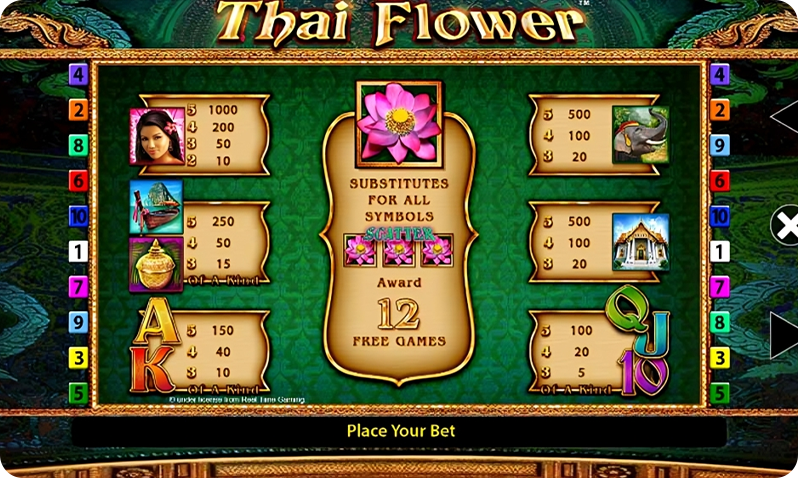 Thai Flower features a grid comprising 5 reels, 3 rows, and 10 paylines. The paylines are fixed and don’t change.